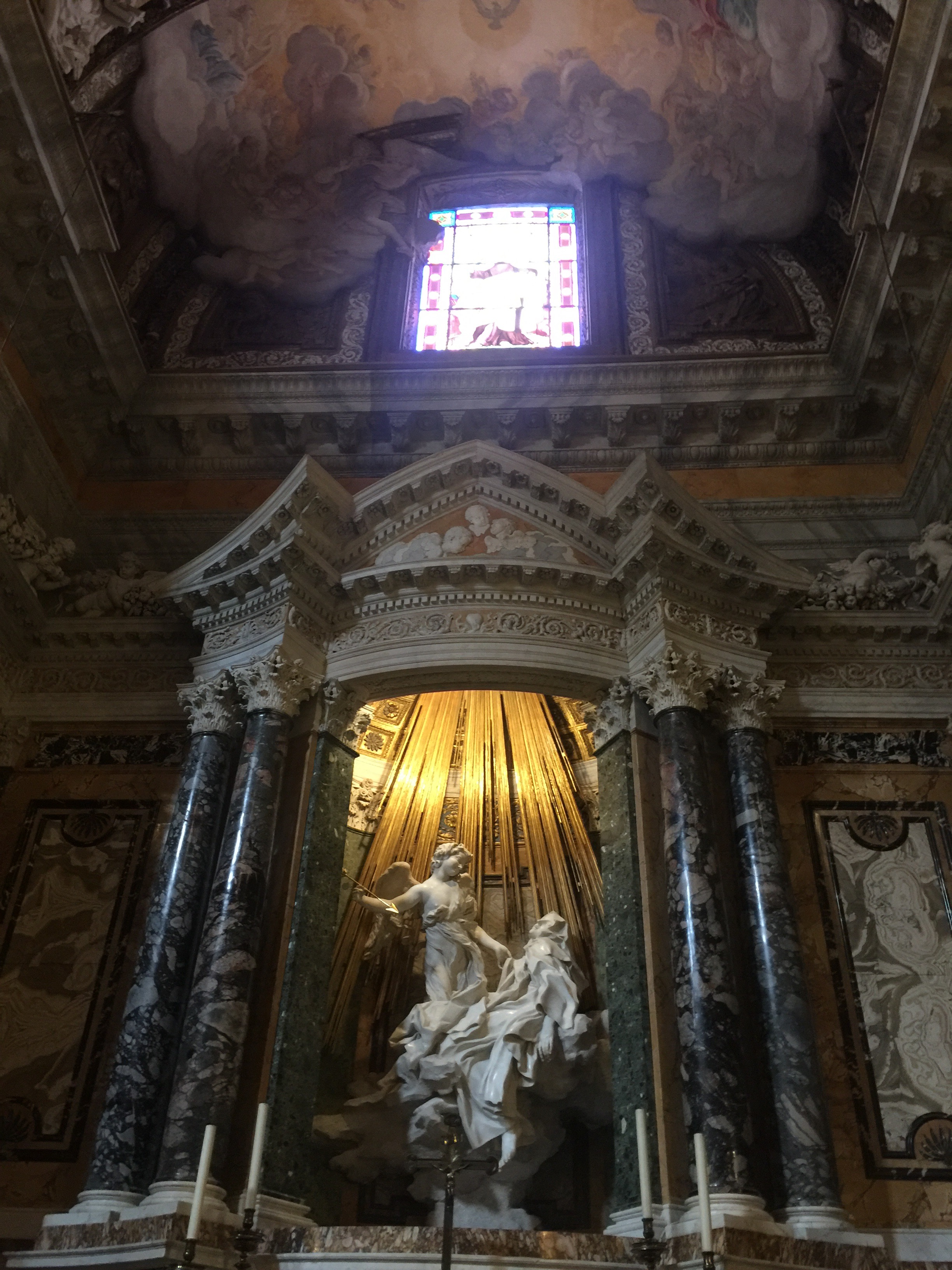 在擁有接近千座教堂的羅馬,一座小小的、很不起眼的教堂因丹布朗「天使與魔鬼」的小說一炮而紅,為什麼呢?因為教堂裡收藏了一件大師級雕塑作品,貝尼尼的《聖德雷莎的狂喜》,天使手持著一把金色長矛,燃著烈火,往聖女德雷莎的心臟刺去。