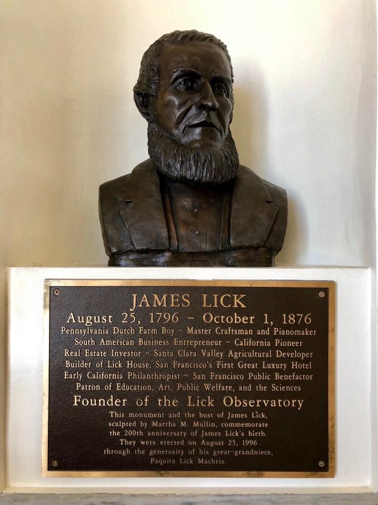 James Lick最早是靠著製造鋼琴跟販賣巧克力致富的,可惜的是,他生前並沒有機會親眼看到天文台興建完成,而他的遺骸在1887年1月9日時被安葬在0.91m詹姆士利克望遠鏡的基座底下,伴隨著望遠鏡願以仰望無垠星空與浩瀚宇宙;而圖片中的紀念碑則是在他200歲冥誕時所建立的。