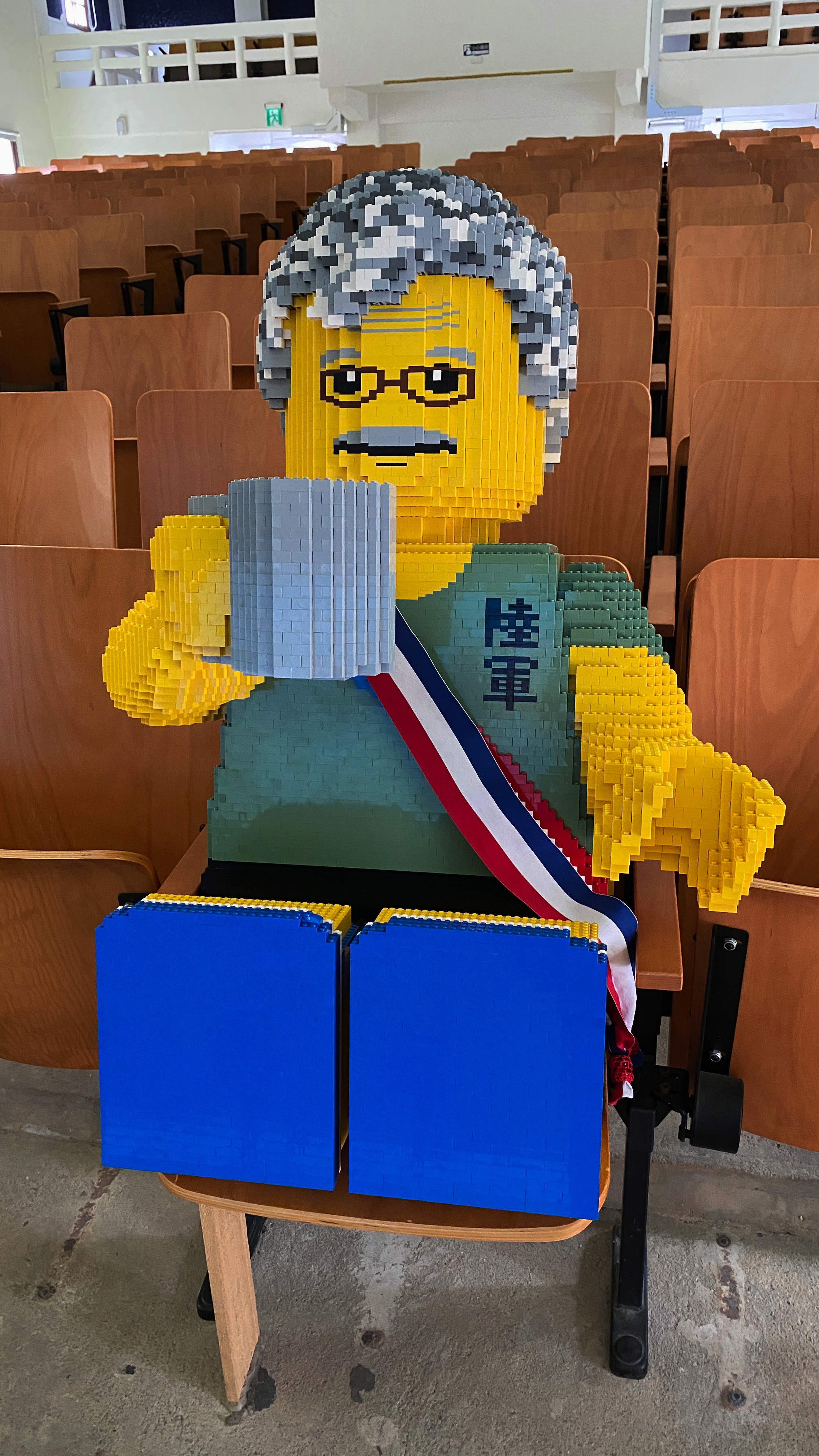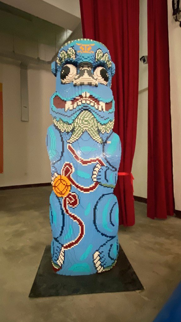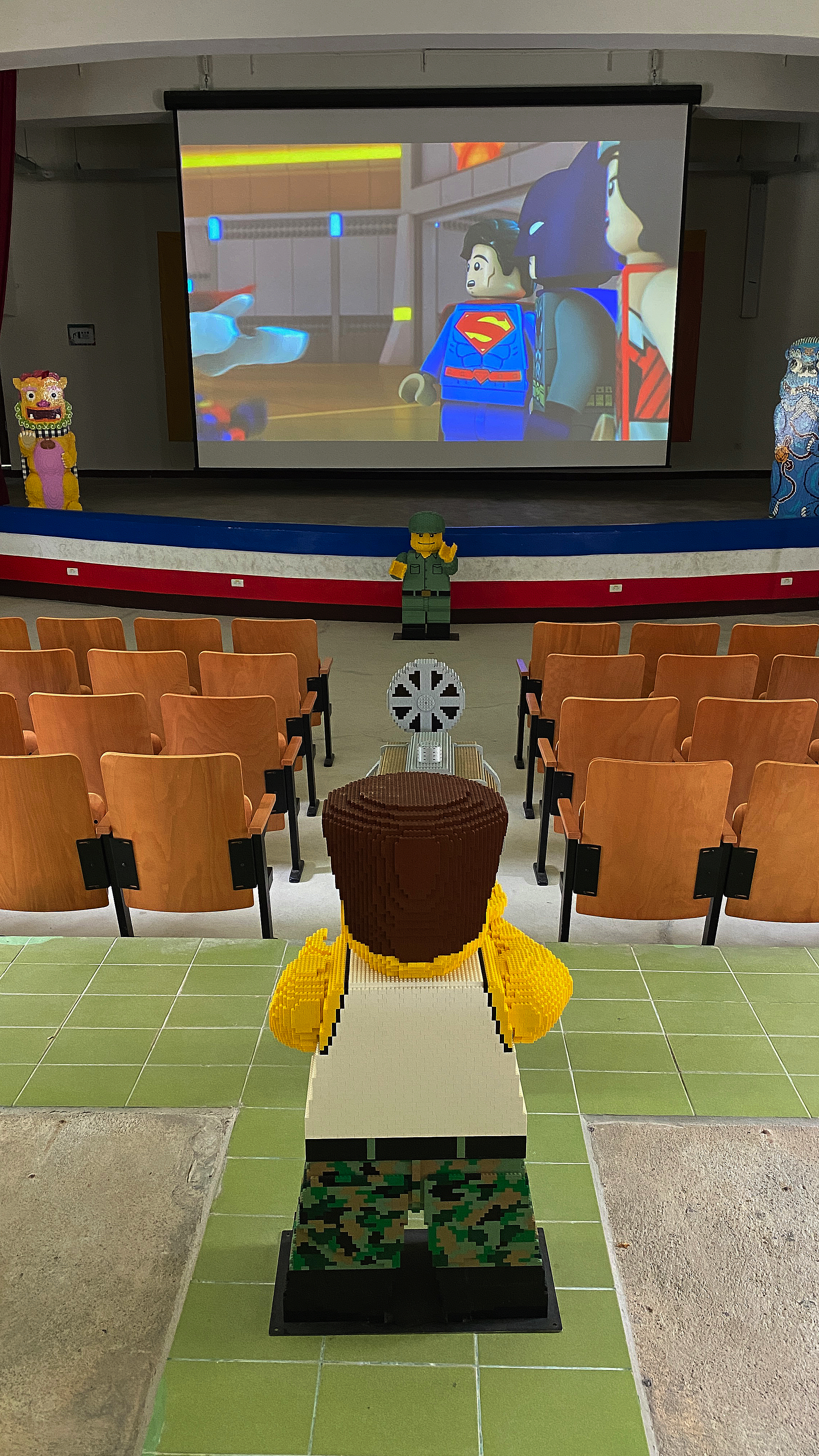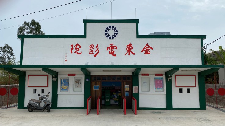 ↑ 金東電影院,建於1960年,為了慰勞金門前線軍官而提供軍人休憩的場所,現況保存良好,並與樂高合作,用積木創作出風獅爺與軍官,頗具趣味。